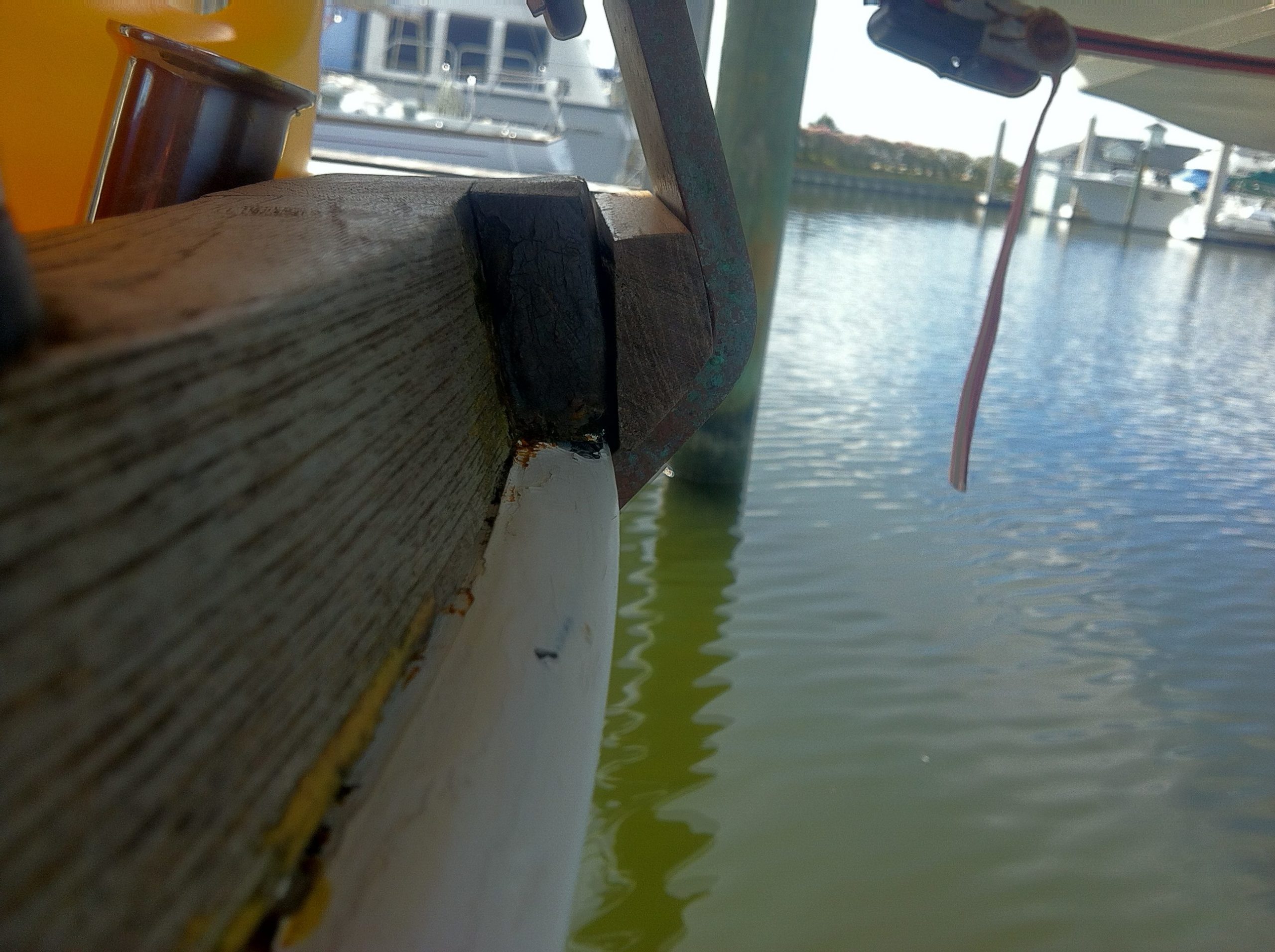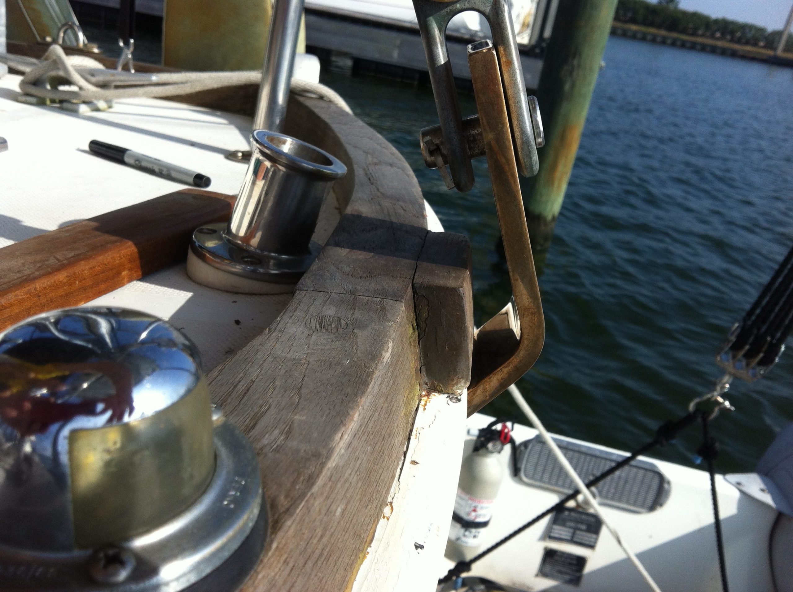 The stern chain plate was a simple remove and replace.  Here’s the new bronze one installed on the stern showing how the bend is not quite where it should be.