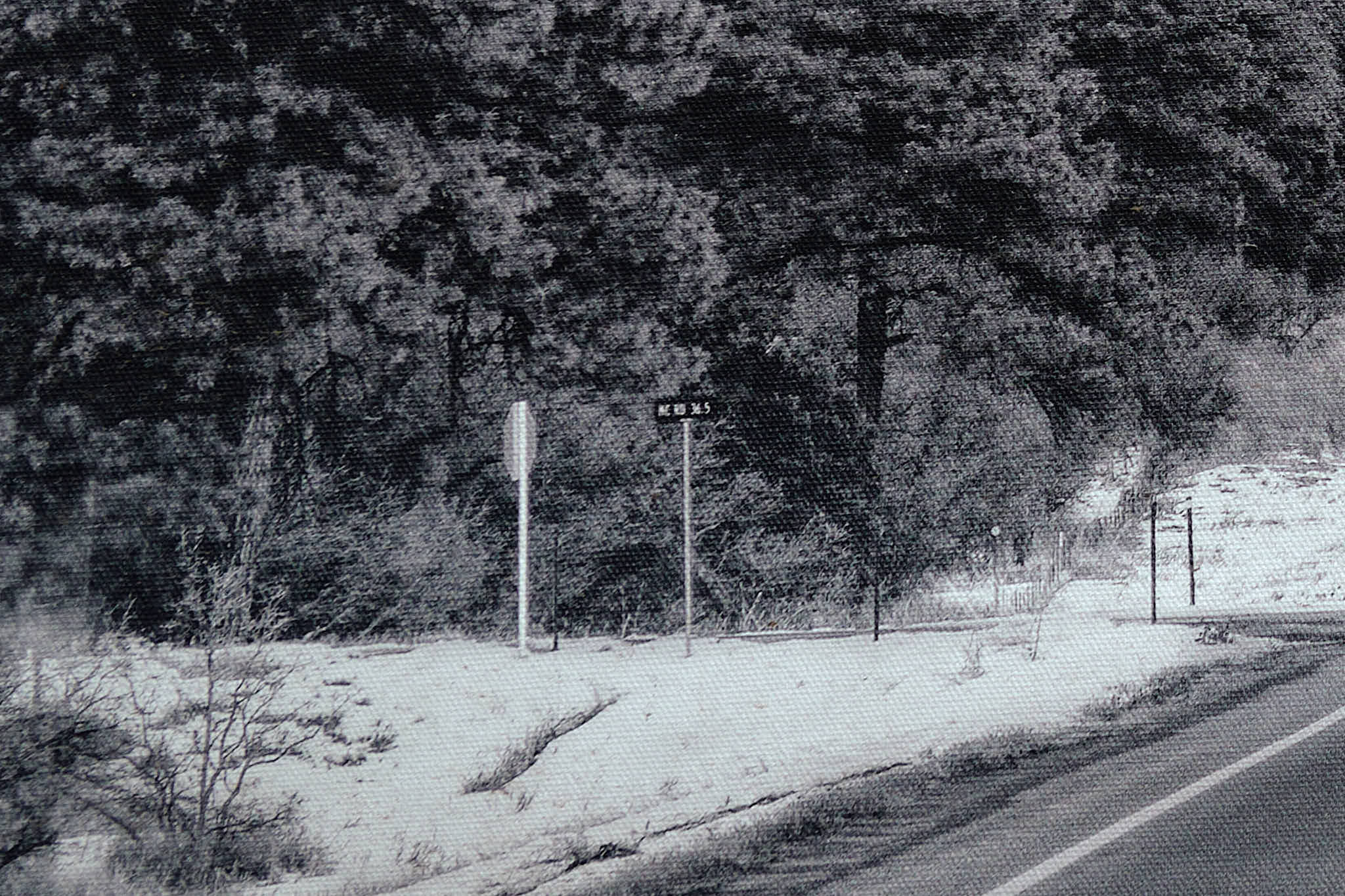 some days later, i was again out walking. i remembered this scenic representation and once more stopped in the hopes of coming to a definitive conclusion about whether it was a painting or a photograph. i poured over the scene looking for clues. if there were any passersby they for sure thought i was more than several marbles short of a full jar. i had my glasses off and was as close to this thing as i could possibly get so i could inspect it. had i a loupe on my person, i would no doubt have had it out. i still could not determine what it was. i continued on down the trail.