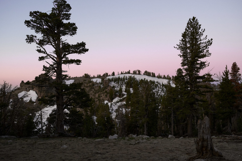 as i hiked up relay peak, it became evident that i was not going to be making quick progress. snow was piled on the slopes. i was kicking in snow steps and going under small trees that had been bent across the trail from the mass of all the snow that had fallen this winter. my legs were quivering from walking bent over with a full pack and 3 liters of water. every muscle in my body was tensed up in an attempt to keep from making a misstep and sliding down the steep, snowy slopes.